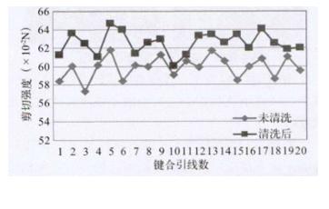 由图5可以看出,用微波等离子清洗过的电路的键合引线焊接强度好于未清洗的电路。这主要是因为清洗能够清除键合指镀金层表面的微小污物,减小镀金层表面浸润角,有效改善焊接面浸润性,增强焊接材料的互融,从而有效地增强引线焊接强度。