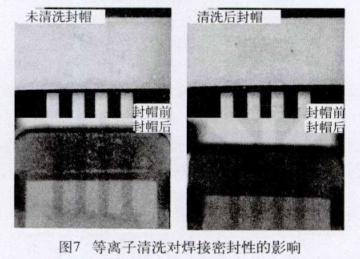 封帽前清洗优化焊接面盖板封帽作为电路陶瓷封装工艺中的后道关键工序,其密封性以及盖板和焊环的焊接强度直接影响电路的可靠性和使用寿命。取两只焊环表面有微量沽污的电路,一只用N2/H2,等离子体清洗20min,另一只不作清洗,在同样的工艺条件下进行合金封帽,最后用x射线检测焊接面焊接情况。图7所示为封帽前后的图片和x射线图像。