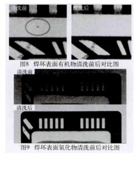 图8是焊环表面斑点状的有机物沽污,采用O2等离子体可清除掉,提高了密封焊接面的有效焊接面,减少孔隙的产生。