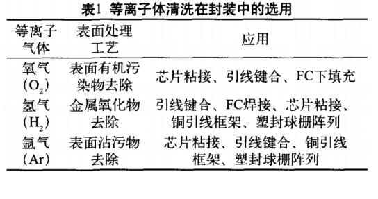 等离子体清洗在半导体封装领域应用广泛。根据材料表面氧化、助焊剂残留、树脂残迹、有机物等不同沾污物的性质,选择相适应的气体,清除掉这些污染物,从而显著地改善封装可制造性、可靠性及提高成品率,表1是等离子体清洗工艺的应用。