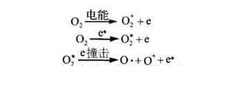上述反应式表示氧气在微波高能电场作用下,初步生成O2阳离子和高速运动的自由电子;氧气在激发态的自由电子的轰击作用下变为激发态,生成了自由电子的过程;激发态的氧气分子在高速运动的自由电子作用下生成大量的氧自由基、氧正离子和激发态的自由电子。
