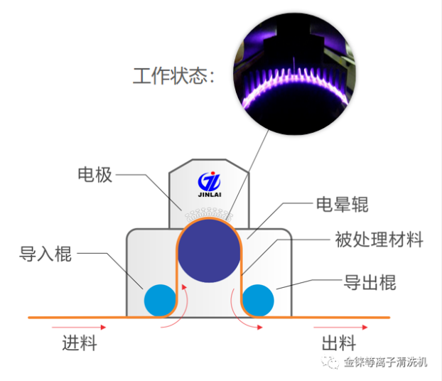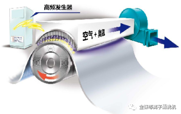 电晕处理的原理是在处理设备上施加高频、高压电,使其产生高频、高压放电,产生细小密集的紫蓝色火花??掌缋牒蟛母髦掷胱釉谇康绯〉淖饔孟拢铀俨⒊寤鞔碜爸媚诘牟牧媳〔?。使材料分子的化学键断裂而降解,增加表面粗糙度和表面积。放电时还会产生大量的臭氧,臭氧是一种强氧化剂,能使材料分子氧化,产生羰基与过氧化物等极性较强的基团,从而提高了其表面能。